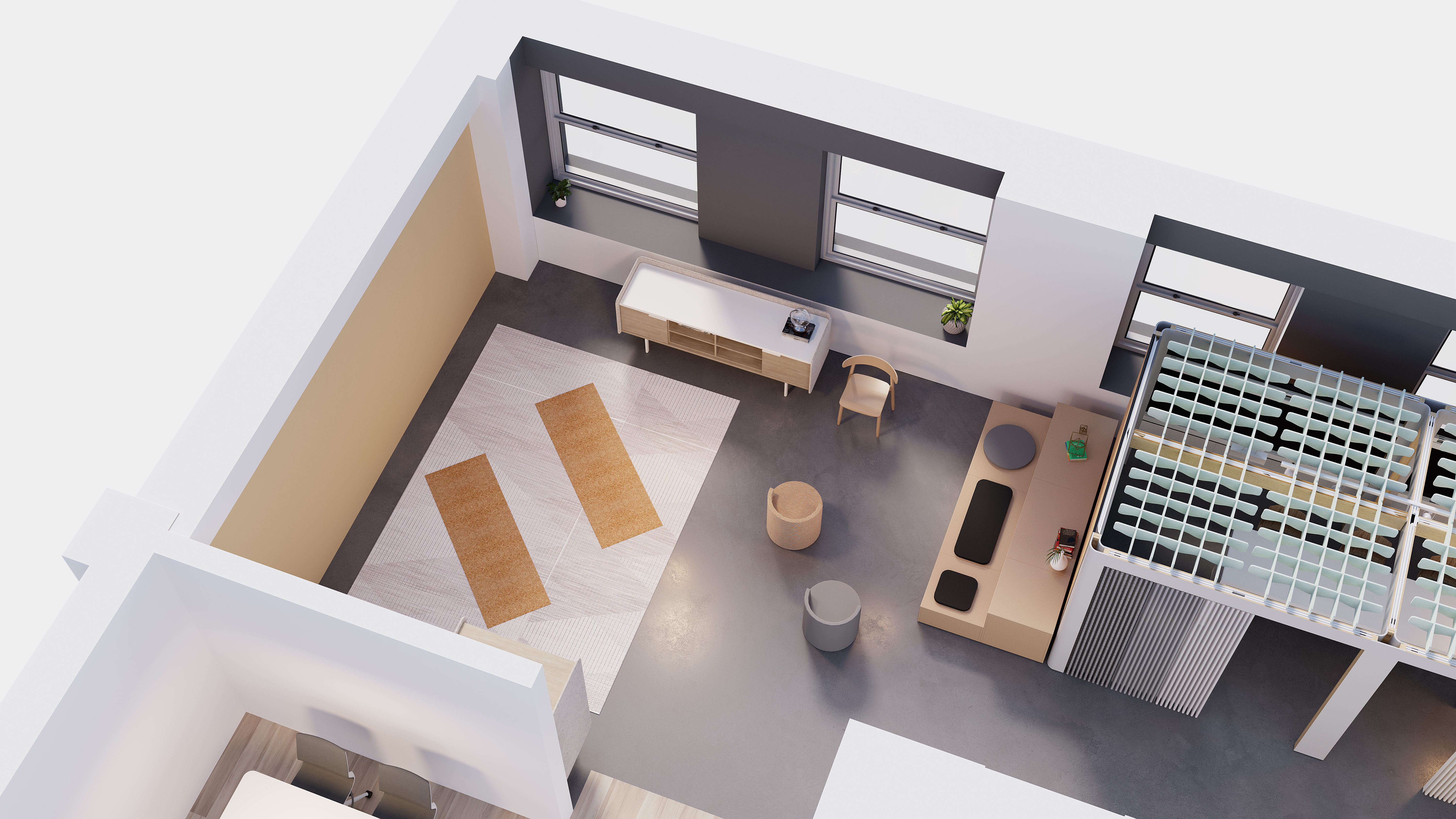 - Acoustical value found in sound dampening textiles and decorative rugs throughout.